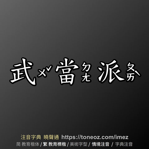 武當派,注音ㄨˇ ㄉㄤ ㄆㄞˋ,拼音wǔ dāng pài,辭典解釋為:拳法的一派。起源武當山,相傳其祖師為張三丰,以內功著名。