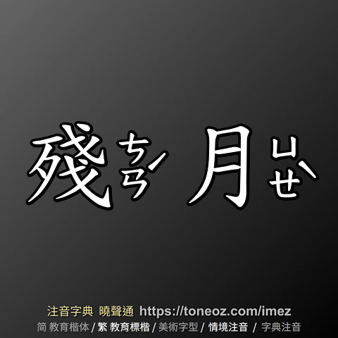殘月,注音ㄘㄢˊ ㄩㄝˋ,拼音cán yuè,辭典解釋為:將落的月亮。唐.白居易〈客中月〉詩:「曉隨殘月行,夕與新月宿。」宋.柳永〈雨霖鈴.寒蟬淒切〉詞:「今宵酒醒何處,楊柳岸,曉風殘月。」