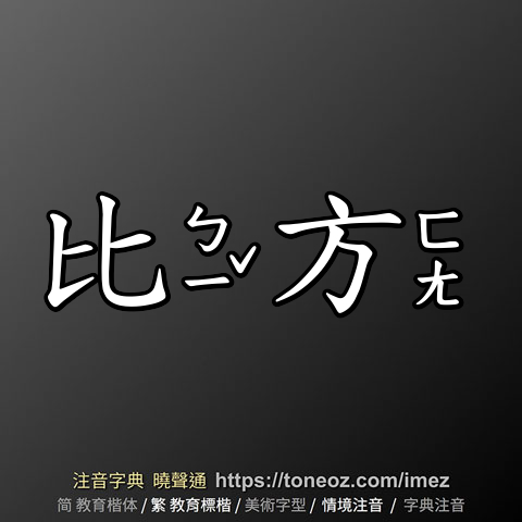 比方,注音ㄅㄧˇ ㄈㄤ,拼音bǐ fāng,辭典解釋為:用比較淺顯、具體的方式,說明難以了解的意念。例:打個比方,他目前的處境,正是泥菩薩過江──自身難保。