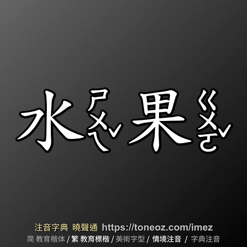 水果,注音ㄕㄨㄟˇ ㄍㄨㄛˇ,拼音shuǐ guǒ,辭典解釋為:可以生食,內含有漿液的果實。如橘子、梨子、西瓜、鳳梨等。例:多吃水果,有益於養顏美容,幫助消化。