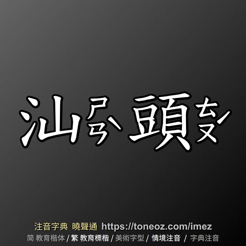 汕頭,注音ㄕㄢˋ ㄊㄡˊ,拼音shàn tóu,辭典解釋為:位於廣東省東北部,南臨南海,北濱韓江口的城市。為閩西、粵東出海的要道,華僑來往的大口岸,位於潮汕鐵路的終點,交通便利,商務繁盛。