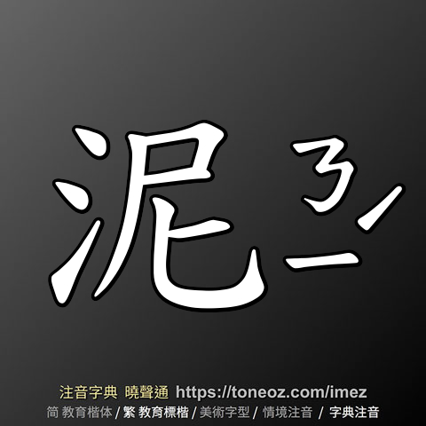 泥,注音ㄋㄧˊ,拼音ní,辭典解釋為:1.水和土的混合物。例:泥巴、汙泥 2.搗碎、壓碎調勻後,像泥狀的東西。例:棗泥、芋泥、蒜泥