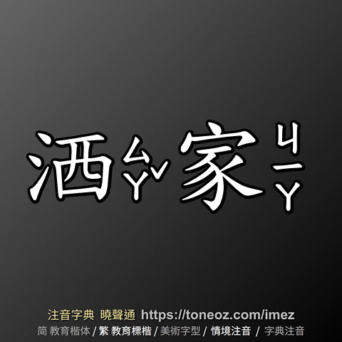 洒家,注音ㄙㄚˇ ㄐㄧㄚ,拼音sǎ jiā,辭典解釋為:宋、元時,關西一帶人的自稱。例:今天我們演話劇,當扮魯智深的小胖說:「洒家就是花和尚。」時,臺下的觀眾都笑翻了。