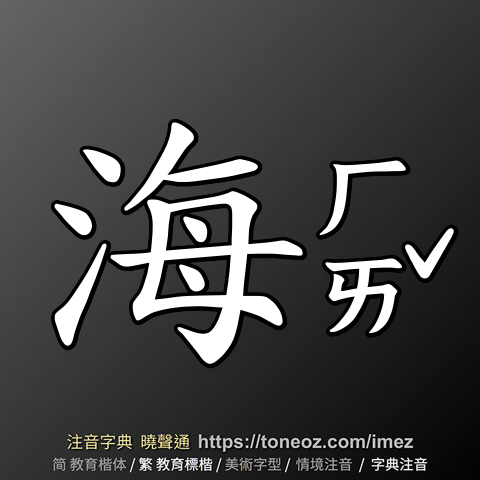 海,注音ㄏㄞˇ,拼音hǎi,辭典解釋為:1.地球上鄰接大陸而面積小於洋的水域。如南海、黃海、地中海。有些面積較大的湖也稱海。如青海、裡海。  2.比喻積聚眾廣的人或事物。例:人海、火海、學海無涯 3.巨大的。例:海量、誇下海口 4.豪邁的、直爽的。例:海派 5.姓。