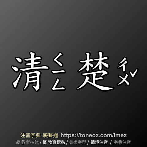 清楚,注音ㄑㄧㄥ ㄔㄨˇ,拼音qīng chǔ,辭典解釋為:清晰明白。例:對於童年往事,他依然記得非常清楚。