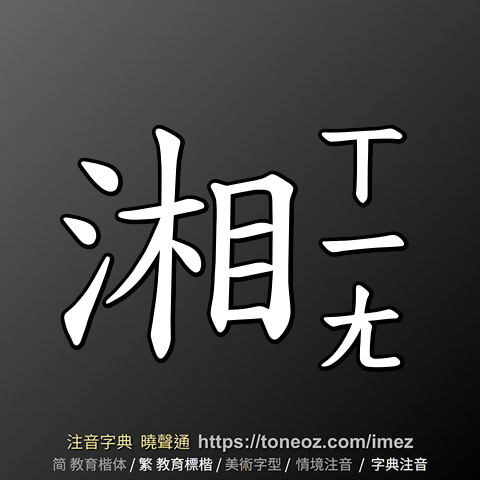 湘,注音ㄒㄧㄤ,拼音xiāng,辭典解釋為:1.→湘江 2.湖南省的簡稱。
