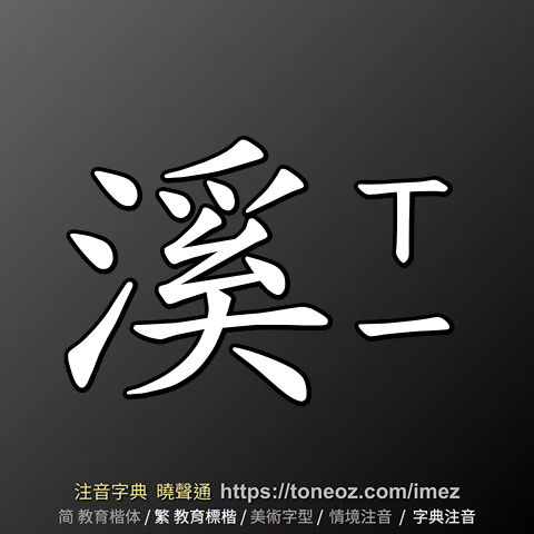溪,注音ㄒㄧ,拼音xī,辭典解釋為:山間的小河流。後泛指小河。例:溪澗、山溪