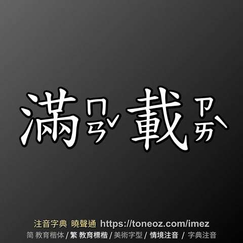 滿載,注音ㄇㄢˇ ㄗㄞˋ,拼音mǎn zài,辭典解釋為:1.載滿東西。例:這艘貨輪滿載醫藥食品,正準備前往災區賑災。 2.形容速度、負荷量達到最高極限。例:今日用電吃緊,各電廠均滿載發電。