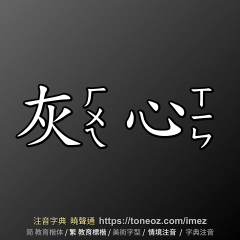 灰心,注音ㄏㄨㄟ ㄒㄧㄣ,拼音huī xīn,辭典解釋為:受到挫折而意志消沉、喪失信心。例:我們不可因為小小的挫折便灰心喪志。