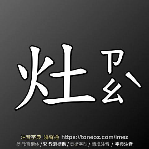 灶,注音ㄗㄠˋ,拼音zào,辭典解釋為:以磚土、石塊等砌成,用來生火烹飪的設備。例:土灶、爐灶、石灶