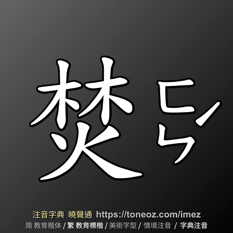 焚,注音ㄈㄣˊ,拼音fén,辭典解釋為:1.燃燒。例:焚化、玩火自焚、憂心如焚 2.熱而乾燥的。例:焚風