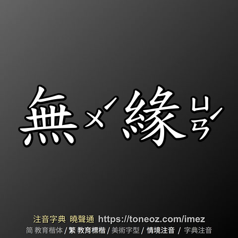 無緣,注音ㄨˊ ㄩㄢˊ,拼音wú yuán,辭典解釋為:1.沒有緣分。例:無緣相識 2.沒來由,沒原因。例:無緣無故