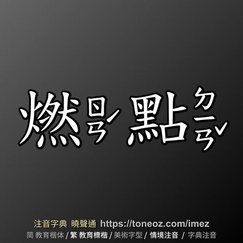 燃點,注音ㄖㄢˊ ㄉㄧㄢˇ,拼音rán diǎn,辭典解釋為:物質在空氣或氧中加熱時,開始燃燒所需的最低溫度。如木炭的燃點為350∼550℃。