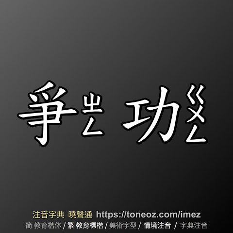 爭功,注音ㄓㄥ ㄍㄨㄥ,拼音zhēng gōng,辭典解釋為:爭取功勞。《薛仁貴征遼事略》:「恐眾文武不伏之人,於教場中躍馬橫鎗搦三次,有爭功者臣與比試,無爭者恁時掛印未遲。」《三國演義》第五九回:「眾將得令,各要爭功,迤邐追襲。」