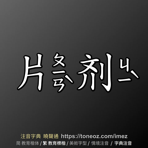 辭典解釋為:片,1.薄而扁平的東西。例:肉片、紙片、唱片 2.少數的、簡短的。例:片刻、片簡殘牘、隻字片語 3.單一的。例:片面 4.將刀橫著或斜著,把厚物切成薄片。例:片魚、片肉  5.量詞:(1) 計算薄而成片的東西的單位。例:一片樹葉、兩片土司 (2) 計算地面物的單位。例:一片樹林、門前兩側各有一片草地...