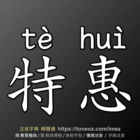 特惠,注音ㄊㄜˋ ㄏㄨㄟˋ,拼音tè huì,辭典解釋為:特別優惠。例:為慶祝開幕,本公司推出百項商品以超低價特惠供應。