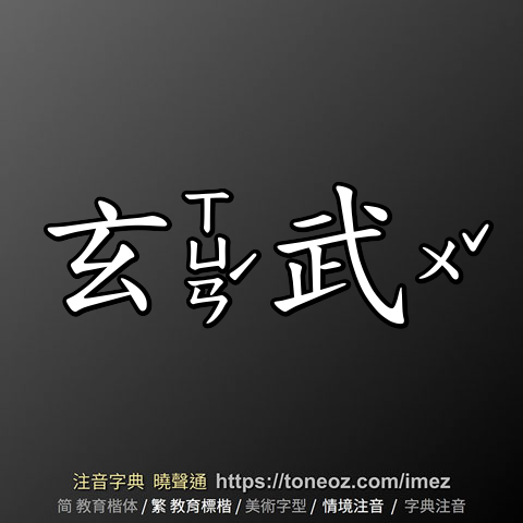 玄武,注音ㄒㄩㄢˊ ㄨˇ,拼音xuán wǔ,辭典解釋為:1.北方的神,即今道教所奉祀的真武大帝,宋代因避諱改玄為真。又因其居北方,北方屬水,故一說為水神。《後漢書.卷二二.王梁傳》:「玄武,水神之名。」唐.章懷太子.注:「玄武,北方之神,龜蛇合體。」 2.星座名。由位於北方的斗、牛、女、虛、危、室、壁等七宿組成。即今西洋的人馬、寶瓶、摩羯等星座。