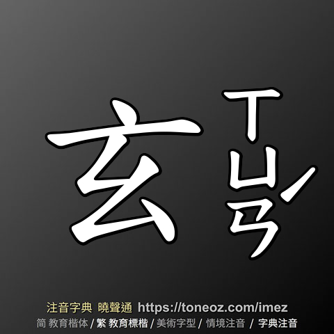 玄,注音ㄒㄩㄢˊ,拼音xuán,辭典解釋為:1.黑色。例:玄狐 2.深遠奧妙。例:玄妙、玄理