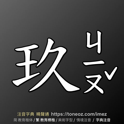 玖,注音ㄐㄧㄡˇ,拼音jiǔ,辭典解釋為:1.比玉稍差的黑色玉石。例:瓊玖 2.九的大寫。