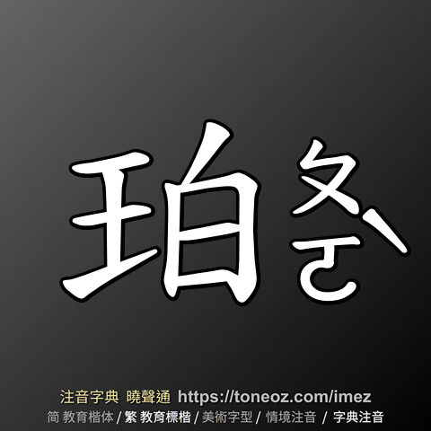 珀,注音ㄆㄛˋ,拼音pò,辭典解釋為:→琥珀