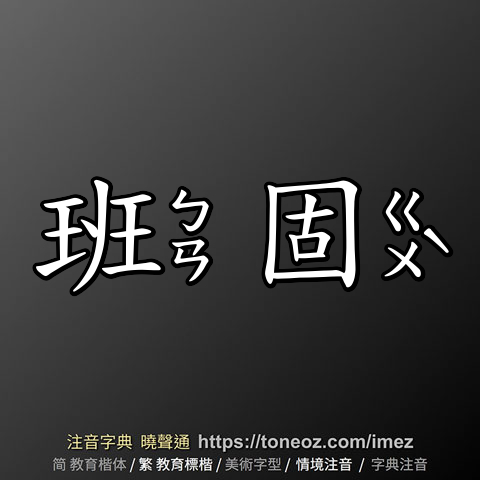 班固,注音ㄅㄢ ㄍㄨˋ,拼音bān gù,辭典解釋為:人名。(西元32~92)字孟堅,漢班彪子,明帝時為郎,曾與傅毅典校祕書,後續其父彪所著《漢書》,積二十餘年乃成。為斷代史之祖。著有〈兩都賦〉、〈封燕然山銘〉等四十餘篇作品,傳於後世。