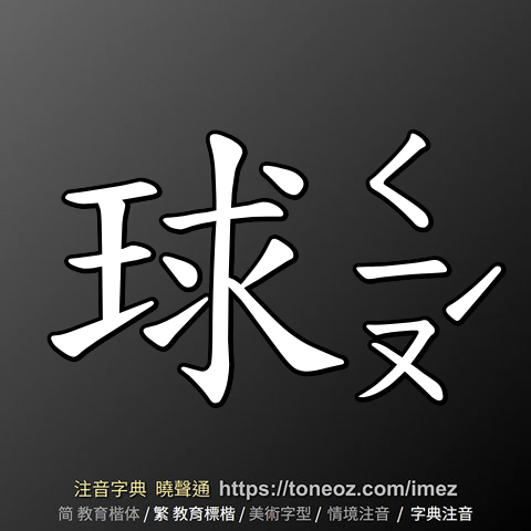 球,注音ㄑㄧㄡˊ,拼音qiú,辭典解釋為:1.數學上指以半圓的直徑為軸,使半圓旋轉一周而成的立體。由球心至表面各點距離皆相等。例:球體 2.圓形或球形物的通稱。例:棉球、籃球、紅血球 3.專指地球。例:全球、環球、北半球 4.量詞。計算球狀物的單位。例:兩球毛線、兩球冰淇淋