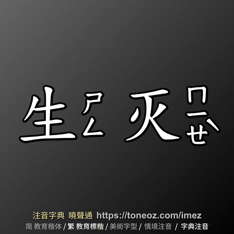 辭典解釋為:生,1.與「死」相對:(1) 生物生命的開始。例:出生、誕生、生於民國元年元旦 (2) 活著、有生命的。例:生擒、生龍活虎、栩栩如生 2.發育、長出。例:生根、生髮、旁生枝節 3.發生、弄出。例:生病、生事、生氣 4.生命、性命。例:求生、輕生、放生 5.活著的期間。例:今生、此生、餘生 6.點燃。例:生火、生爐子 7.與「熟」相對:(1) 未經烹煮過的。例:生水、生食、生冷食物 (2) 罕見、不熟悉的。例:生人、生字、生面孔 (3) 技藝不熟練的。例:生手、生硬 (4) 未經加工煉製的。例:生藥、生鐵、生茶 (5) 果實尚未長成。例:這桃子夾生,十分澀口。 8.很、非常。例:生怕、生恐 9.學藝的人或讀書人。例:學生、師生、書生 10. 一種戲劇腳色。扮演男子,有小生、武生、老生、鬚生之區別。...