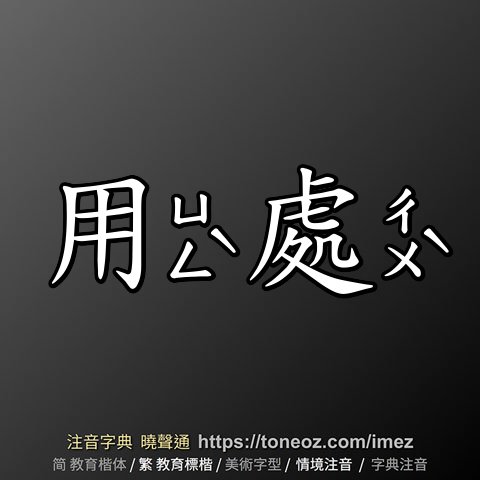 用處,注音ㄩㄥˋ ㄔㄨˋ,拼音yòng chù,辭典解釋為:用途。例:酒精的用處很多,是工業上不可缺少的原料。