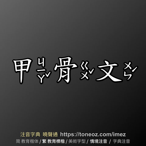 甲骨文,注音ㄐㄧㄚˇ ㄍㄨˇ ㄨㄣˊ,拼音jiǎ gǔ wén,辭典解釋為:商代人占卜時刻於龜甲、獸骨上的文字。清光緒二十五年(西元1899)在河南省安陽縣小屯村發現。又民國六十年,陝西省歧山縣亦出土西周早期甲骨文字。例:甲骨文是研究我國上古文化的寶藏。 △卜辭、龜甲文字、契文、貞卜文字、殷契、殷墟卜辭、殷墟書契、殷墟文字