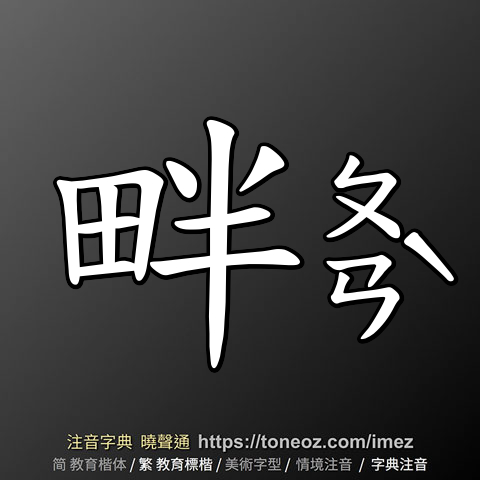 畔,注音ㄆㄢˋ,拼音pàn,辭典解釋為:1.田界。例:田畔 2.邊側、旁側。例:湖畔、枕畔、橋畔