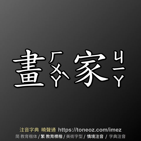 畫家,注音ㄏㄨㄚˋ ㄐㄧㄚ,拼音huà jiā,辭典解釋為:精於繪畫而能自成一家的人。例:徐悲鴻是中國近代以擅長畫馬而著名的畫家。