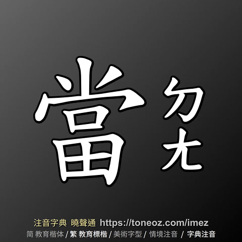 當,注音ㄉㄤ,拼音dāng,辭典解釋為:1.擔任。例:當差、當老師