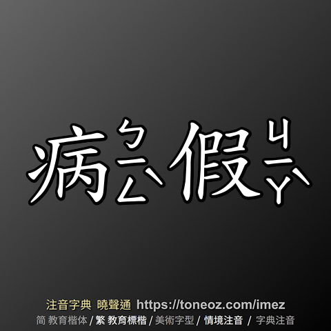 病假,注音ㄅㄧㄥˋ ㄐㄧㄚˋ,拼音bìng jià,辭典解釋為:因生病而請的假。例:近來流行性感冒肆虐,請病假的人日漸增多。