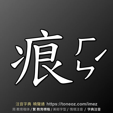 痕,注音ㄏㄣˊ,拼音hén,辭典解釋為:1.傷疤。例:傷痕、刀痕 2.比喻事物留下的印跡。例:淚痕、苔痕、墨痕