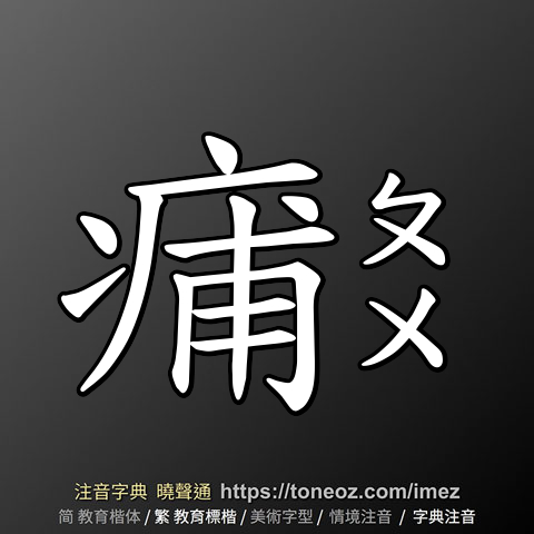 痡,注音ㄆㄨ,拼音pū,辭典解釋為:[動] 疲病。《詩經.周南.卷耳》:「我馬瘏矣,我僕痡矣,云何吁矣。」唐.李華〈弔古戰場文〉:「漢傾天下,財殫力痡。」