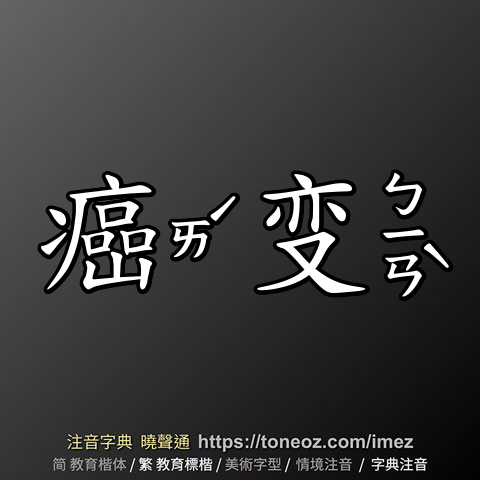 辭典解釋為:癌,人體組織中某種細胞發生不正常增殖的現象。這種細胞不僅增生迅速,而且破壞力強,可經由血液或淋巴到處轉移,破壞周圍組織,威脅生命。癌細胞發生的原因不明,生長的部位不同,症狀也不一樣。若有異常出血、分泌,或身上發現硬塊、傷口長久不癒等症狀,均可能為癌症的癥兆,應及早檢查,及早治療。例:肺癌、肝癌、子宮癌 △癌症...