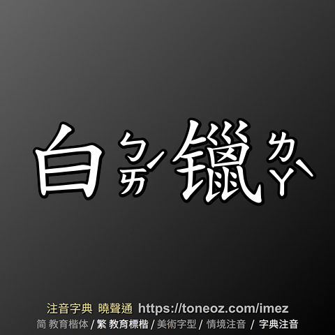辭典解釋為:白,1.完全反射光線,像雪或乳汁般素淨的顏色。與「黑」相對。例:雪白、純白、黑白分明 2.白色的。例:白紙、白布、藍天白雲 3.清楚。例:真相大白、含冤莫白、明白 4.空空的,沒加上任何東西的。例:白飯、白開水 5.徒然、枉費。例:他們只認得錢,託他們真是白託。 6.不付代價而得好處。例:白吃、白喝 7.以合法掩護非法,以正當掩護不法的。與「黑」相對。例:白道 8.陳述、說話。例:自白、表白、道白 9.字寫錯。例:這字寫白了。 10. 姓。...