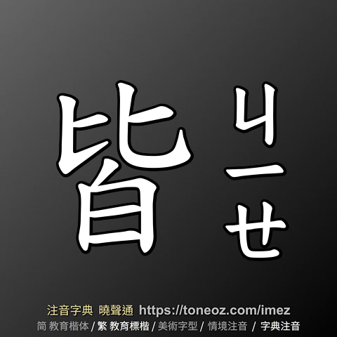 皆,注音ㄐㄧㄝ,拼音jiē,辭典解釋為:全、都。例:比比皆是、草木皆兵、啼笑皆非