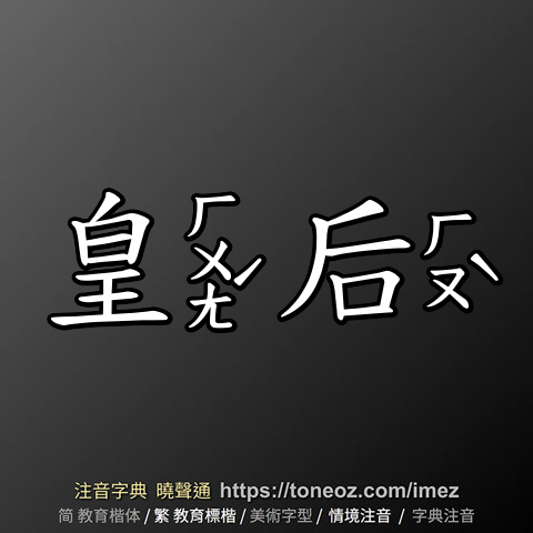皇后,注音ㄏㄨㄤˊ ㄏㄡˋ,拼音huáng hòu,辭典解釋為:皇帝的正妻。例:武則天當上皇后之後,就開始干預國政。