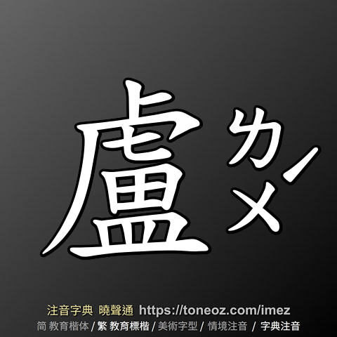 盧,注音ㄌㄨˊ,拼音lú,辭典解釋為:1.黑色的。例:彤弓盧矢 2.姓。