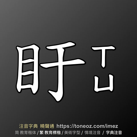 盱,注音ㄒㄩ,拼音xū,辭典解釋為:[動] 睜開眼睛凝視。唐.韓愈〈謁衡嶽廟遂宿嶽寺題門樓〉詩:「廟令老人識神意,睢盱偵伺能鞠躬。」 [形] 1.大的。通「訏」。《漢書.卷八五.谷永傳》:「又廣盱營表,發人冢墓,斷截骸骨,暴揚尸柩。」顏師古注引晉灼曰:「盱,大也。」 2.憂愁。《詩經.小雅.都人士》:「我不見兮,云何盱矣。」 [名] 姓。如晉代有盱烈。