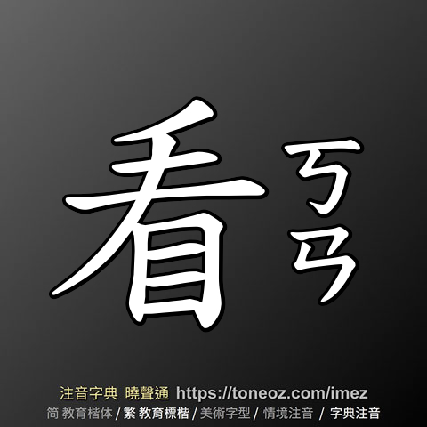 看,注音ㄎㄢˋ,拼音kàn,辭典解釋為:1.視、瞧。例:看見、收看、觀看 2.觀賞。例:看戲、看熱鬧、看風景 3.對待。例:刮目相看、另眼看待 4.拜訪、探望。例:他南下看老朋友去了。 5.估量、觀察判斷。例:這個計畫,你看行得通嗎? 6.診斷醫治。例:看病、看診 7.用在動詞之後,表示姑且試試的語氣。例:想想看、等等看、試試看