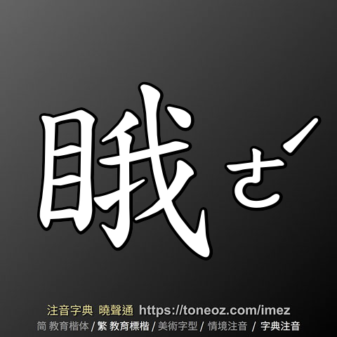 睋,注音ㄜˊ,拼音é,辭典解釋為:[動] 視。《文選.班固.西都賦》:「於是睎秦嶺,睋北阜。」