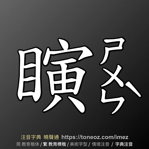 瞚,注音ㄕㄨㄣˋ,拼音shùn,辭典解釋為:[動] 轉動眼珠。《莊子.庚桑楚》:「終日視而目不瞚。」《史記.卷一○五.扁鵲倉公傳》:「中庶子聞扁鵲言,目眩然而不瞚。」