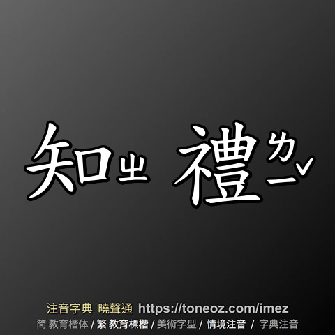 知禮,注音ㄓ ㄌㄧˇ,拼音zhī lǐ,辭典解釋為:1.通曉禮節。《儒林外史》第一六回:「又在外邊學得恁知禮,會打躬作揖!」《紅樓夢》第六六回:「人說他不知禮,又沒眼色。」 2.人名。(西元960~1020)北宋高僧,俗姓金,字約言,四明(今浙江寧波)人。幼年出家為僧,精研律典和天台宗教義。淳化二年(西元991)受請住持四明祥符寺,廣弘天台宗教法,學徒雲集。至道元年(西元995)移居保恩院。大中祥符六年(西元1013)創設念佛施戒會,結合僧俗萬餘人同修念佛、發菩提心。從唐會昌毀佛以來,天台宗漸趨衰微,至知禮天台宗始蔚然中興。著有《十不二門指要鈔》二卷、《四明十義書》二卷等傳世,著名弟子有尚賢、本如、梵臻等。