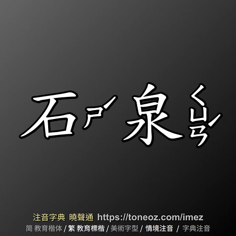 石泉,注音ㄕˊ ㄑㄩㄢˊ,拼音shí quán,辭典解釋為:流經山石間的泉水。《楚辭.屈原.九歌.山鬼》:「山中人兮芳杜若,飲石泉兮蔭松柏。」《文選.左思.招隱詩二首之一》:「石泉漱瓊瑤,纖鱗亦浮沉。」