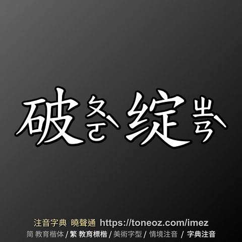 辭典解釋為:破,1.殘破不全的。例:破船、破鞋、破洞  2.毀壞、使碎裂。例:破壞、破釜沉舟 3.擊敗、攻下。例:破城、大破敵軍 4.剖開、劈開。例:勢如破竹、乘風破浪 5.超越。例:破戒、破例、破紀錄 6.花費、消耗。例:破財、破費 7.差勁的、低劣的。例:他的數學非常破。 8.穿、透。例:識破、點破、看破紅塵 9.剖析、分析解釋。例:破題 10. 解除、去除。例:破悶、破涕為笑...