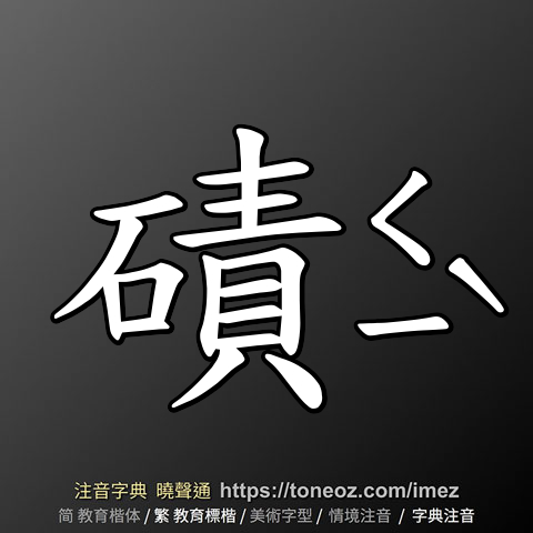 磧,注音ㄑㄧˋ,拼音qì,辭典解釋為:1.淺水中露出的砂石堆。例:石磧 2.沙漠。例:沙磧、大磧 3.地理學上指由冰河帶來的礫泥、沙礫等堆積物,或由這些堆積物所形成的各種地形。例:冰磧丘、冰磧平原