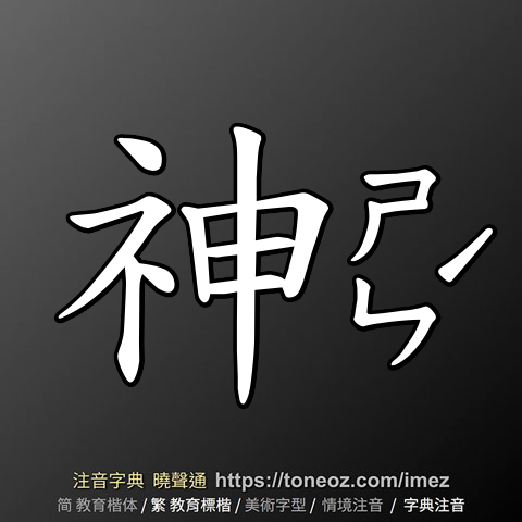 神,注音ㄕㄣˊ,拼音shén,辭典解釋為:1.天地萬物的創造者與主宰者稱為「神」。例:天神、海神、山神 2.人的精氣或注意力。例:留神、傷神、聚精會神 3.稀奇、玄妙、不平凡的。例:神童、神奇、神機妙算