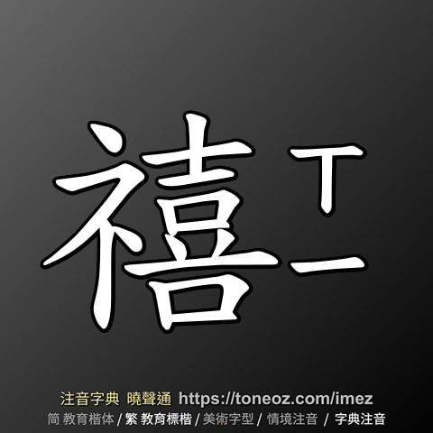 禧,注音ㄒㄧ,拼音xī,辭典解釋為:福祉、吉祥。例:鴻禧、恭賀新禧
